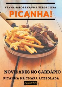 Picanha na chapa acebolada – picanha acebolada e batata frita. Acompanha arroz com brócolis, farofa e vinagrete.