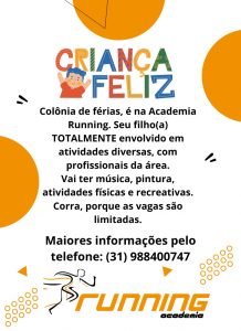 A Academia Running é uma das opções para deixar seu filho(a) poder se distrair em suas férias, em um ambiente totalmente descontraído. A colônia promete muita atividade física e recreativa, além de pintura e música.
