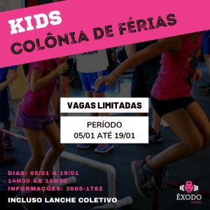 Com muitas brincadeiras lúdicas e de consciência corporal, além de lanche a colônia de férias do Êxodo Cross acontece nos dias 07, 10, 12, 14, 17 e 19, no horário de 14h30 às 16h30.