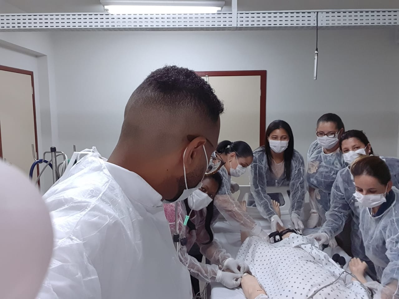Dois professores da faculdade, especialistas em primeiros-socorros e urgência e emergência, dão as aulas teóricas e práticas que usam as salas de metodologia ativa e o laboratório que simula ambiente de UTI, com todo o equipamento e manequim humano responsivo.