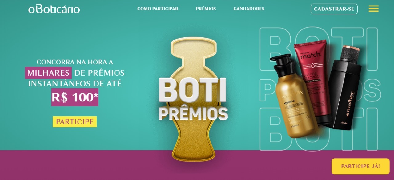 A cada compra no valor de R$ 70 em uma das mais de 3.750 lojas físicas e quiosques do Boticário espalhados pelo país, o consumidor recebe um código promocional impresso na nota fiscal para concorrer aos prêmios. O resultado pode ser conferido na hora, ao enviar esse código pelo WhatsApp do Boti Prêmios (0800 878 2871) ou preenchê-lo no site da promoção (www.botipremios.boticario.com.br). A promoção é exclusiva para compras realizadas em lojas, sendo inválida para transações realizadas pelo site ou na rede de revendedoras.